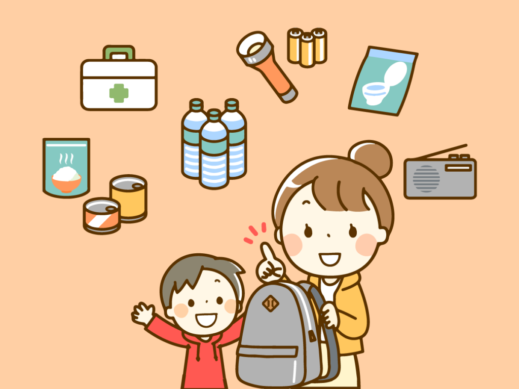 飲料水(1人1日3L×3日分)・3日分の非常食・医薬品・懐中電灯・携帯ラジオ・予備の電池・カセットコンロ・ガスボンベ・貴重品(現金・身分証明書・通帳、印鑑、保険証ほか)